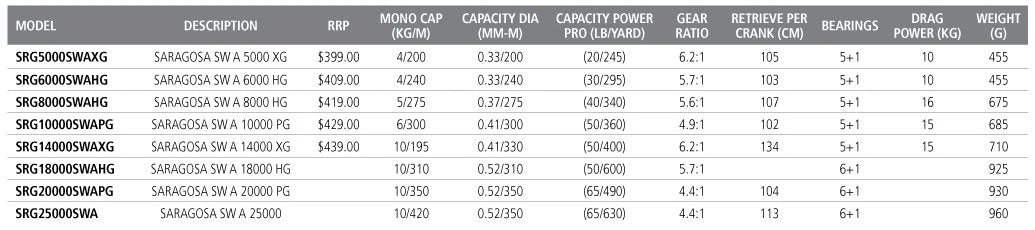 The Saragosa SWA series features 8 models with the 14000XG and 18000HG being new additions for 2020. The new range incorporates top tier Shimano technologies such as X-Protect, X-Ship, Hagane Body and Hagane gear into its lightweight compact body. The newly designed compact body has been engineered to reduce the weight across the entire series, improving the reels handling and balance. Drawing upon the Stella SWC, Infinity Drive is included and provides improved pinion gear support which translates to greater and smoother cranking power. The X-Protect water resistance system improves the line roller durability to an IPX8 standard. Built for big fish in extreme conditions, the Saragosa SWA will continue to push the boundaries.