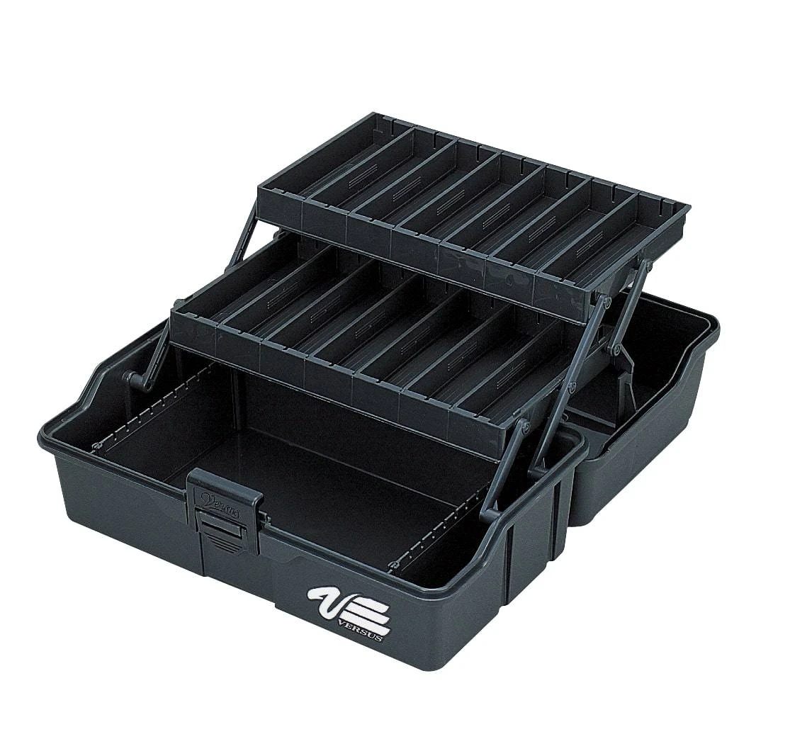 The Versus VS-7030 is premium plastic tackle box that is a must have for your next fishing trip. This large tackle box features two cantilever style trays for maximum storage possibilities. Each tray tier has 6 removable plastic dividers to make custom compartment sizes to fit any sized fishing tackle. The base of the tackle box also has 2 removable dividers with hooks slots for your large lures and rigs. Inside the lid is yet another storage area with 3 built in compartments for a quick grab section. This hinged lid tackle box also has a secure plastic flip latch that keeps the lid shut during transportation and a comfortable carrying handle so you can get it to the boat as easily as possible.