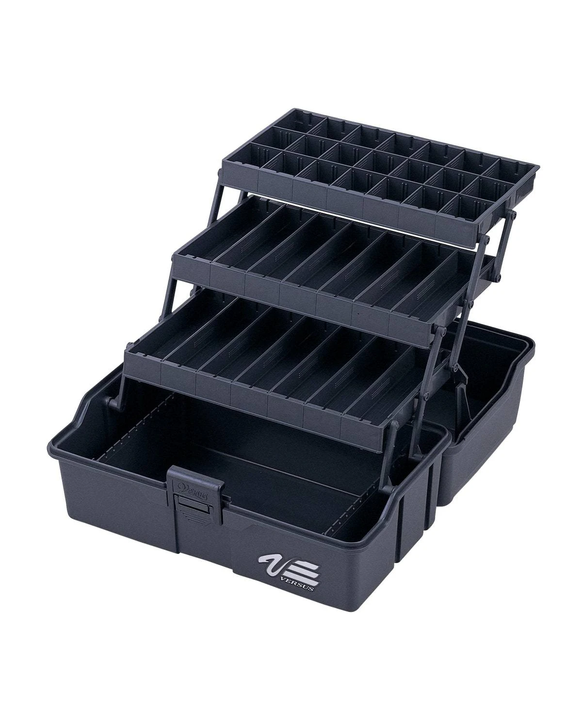 The Versus VS-7010 is premium plastic tackle box that is a must have for your next fishing trip. This large tackle box features two cantilever style trays for maximum storage possibilities. Each tray tier has 4 removable plastic dividers to make custom compartment sizes to fit any sized fishing tackle. The base of the tackle box also has 4 removable dividers with hooks slots for your large lures and rigs. This hinged lid tackle box also has a secure plastic flip latch that keeps the lid shut during transportation and a comfortable carrying handle so you can get it to the boat as easily as possible.